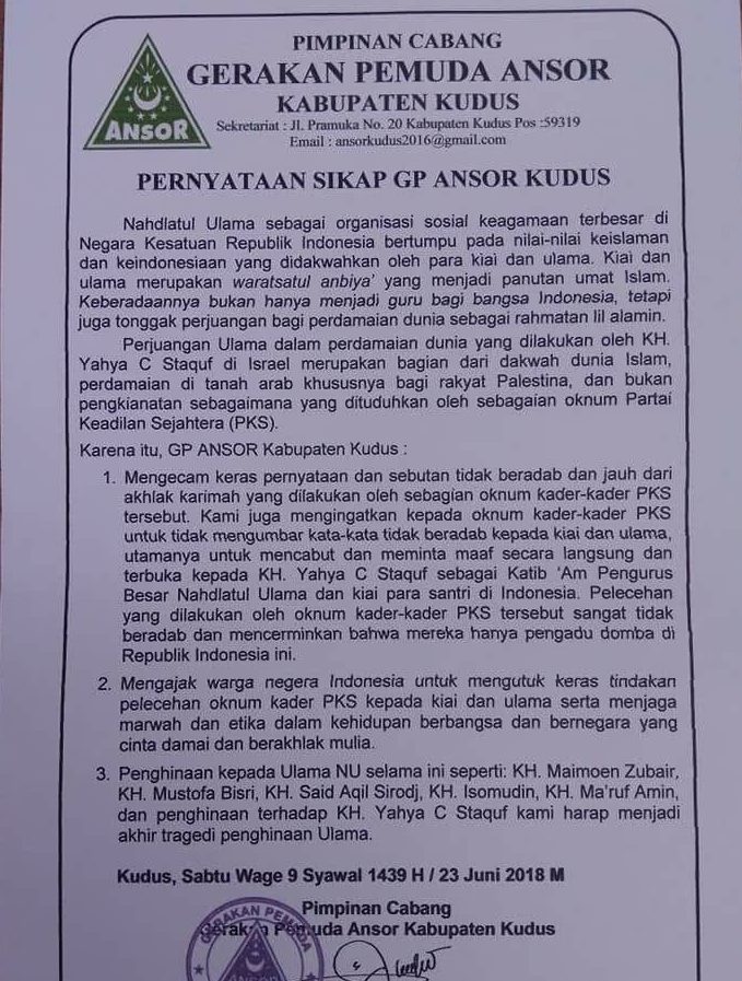 Pertama, mengecam keras pernyataan dan sebutan tidak beradab yang dilakukan oleh oknum tertentu, utamanya kader PKS agar mencabut dan meminta maaf atas pernyataan itu kepada kiai yang bersangkutan.