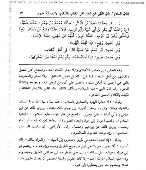 “لاَ تَبْدَؤُوا الْيَهُودَ وَلاَ النَّصَارَى بِالسَّلاَمِ، فَإِذَا لَقِيتُمْ أَحَدَهُمْ فِي طَرِيقٍ، فَاضْطَرُّوهُ إِلَى أَضْيَقِهِ”