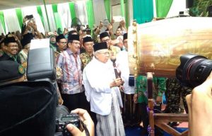 Usai menyampaikan sambutan, Kiai Ma’ruf turun dan menabuh bedug sebagai tanda dibukanya pra Munas-Konbes NU 2017 di Lampung.