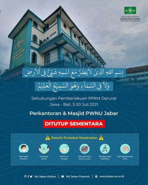 Ketua PWNU Jawa Barat KH Hasan Nuri Hidayatullah mengumumkan bahwa kantor dan masjid PWNU Jawa Barat yang terletak di Jalan Galunggung No 9, Kota Bandung, ditutup sementara waktu.