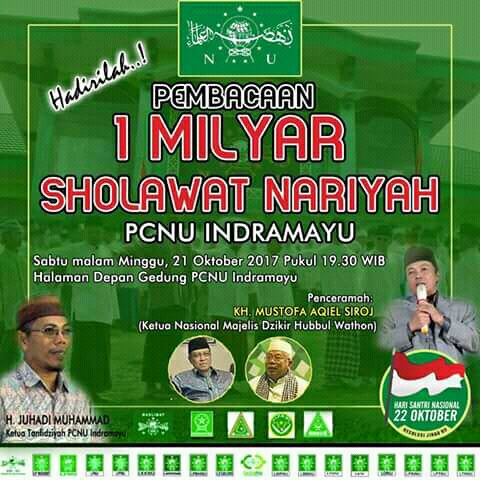 INDRAMAYU – Dalam rangka memperingati Hari Santri Nasional (HSN) yang jatuh pada 22 Oktober, PBNU telah mengintruksikan agar semua santri bersatu padu untuk membaca satu milyar sholawat nariyah.
