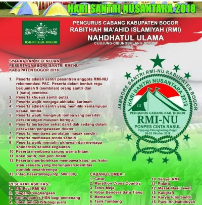 Berikut kami sampaikan Undangan sebagai Peserta pada acara Jambore Santri Nusantara PC-RMI-NU Kabupaten Bogor, Jumat-Senin 19-22 Oktober 2018, di Ponfok Pesantren Cinta Rasul Cibungbulang-Bogor.