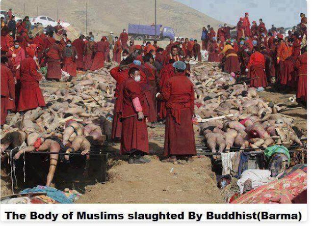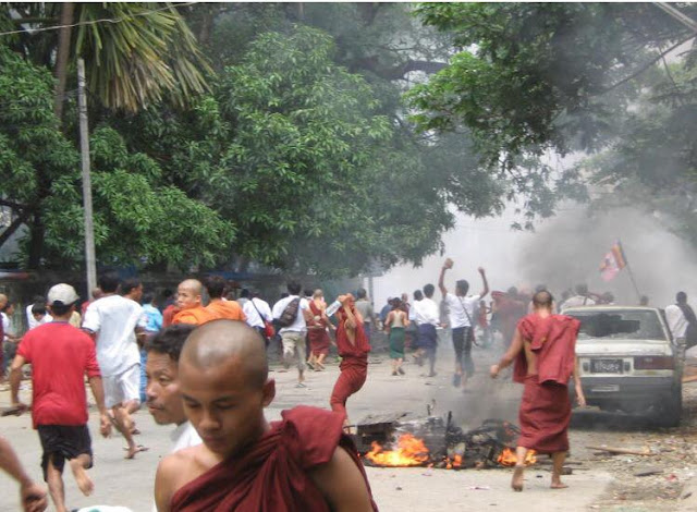 Foto ini bukanlah gambar pertikaian apalagi pembantaian umat muslim yang dilakukan oleh bikhu. Foto ini adalah foto demonstrasi yang dilakukan oleh masyarakat Myanmar terhadap pemerintah atas sulitnya biaya hidup terutama karena kenaikan harga BBM di negara tersebut pada tahun 2007.