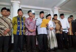 Wapres JK bersama sejumlah Pimpinan Ormas Islam kemudian keluar membacakan pernyataan sikap bersama. Pertemuan tersebut juga dihadiri Menteri Agama Lukman Hakim Saifuddin, Panglima TNI Marsekal Hadi Tjahjanto, dan Kapolri Jenderal Tito Karnavian.