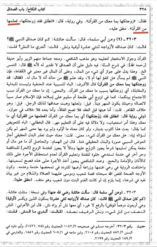Jika membaca buku fikih, ternyata mahar itu harus berbentuk materi (harta bermanfaat) ini pendapat mayoritas ulama (Hanafiyah, Malikiyah, Hanabilah), hanya Syafi’iyah saja yg membolehkan mahar berupa jasa, itu pun harus jasa yang bisa dikonversi ke materi (mutamawwal). Nah terkait mahar dengan hafalan Al-Qur’an, maka mayoritas ulama tidak membolehkannya, alias tidak sah. Adapun hadis tadi, itu maksudnya adalah bukan semata membaca hafalan Al-Qur’an, melainkan “mengajarkan” Al-Qur’an kepada istrinya (baca yg digarisbawahi dlm lampiran kitab). Dan itu clear, karena mengajar itu adalah jasa yang bisa dihargai dengan materi. Atau jika hafalan Al-Qur’an tsb dilantunkan oleh seorang Hafizh atau Qari, maka bisa sah sebagai mahar, karena seorang Hafizh atau Qari bisa mendapatkan materi dari hafalan atau bacaannya tsb, mirip seorang musikus yang memberi mahar dengan sebuah lagu, atau penyair (bukan tukang nyair ikan atau uang di jalan) yang menjadikan puisi sebagai mahar, itu bisa sah. Kalau orang umum, jelas tidak sah, karena dia tidak bisa mendapatkan materi dari bacaan, lagu, puisi yang dia lakukan.