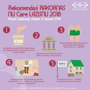 - Pertama, Menjadikan program Kotak Infak Nahdlatul Ulama (Koin NU) yang saat ini sudah menjadi program NU Care-LAZISNU sebagai gerakan nasional bagi seluruh Nahdliyin;