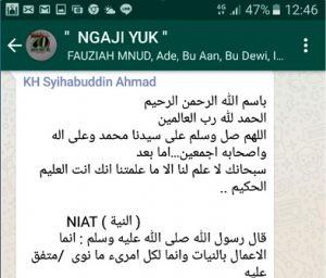 Mengaji sudah menjadi aktivitas biasa dan rutin bagi ibu-ibu Muslimat NU. Bahkan dalam seminggu bisa berkali-kali menghadiri majelis taklim. Tetapi mengaji melalui aplikasi messenger mungkin menjadi hal baru.