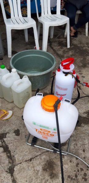 Untuk pembuatan cairan disinfektan, Ayi mengaku belajar dari media sosial. “Di Youtube ada beberapa panduan cara pembuatan. Selain itu kami mencampur Presept yg disumbang oleh donatur ,” katanya