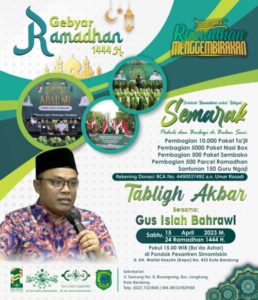 Dia menuturkan, dalam Gebyar Ramadhan 1444 H. ini terdapat berbagai kegiatan yang akan dilaksanakan, diantaranya yaitu SEMARAK (Sedekah Ramadhan untuk Rakyat) dengan menggandeng Pondok Pesantren Sirnamiskin sebagai tuan rumah dan NU Care–Lazisnu Kota Bandung melalui program “Ramadhan Menggembirakan”. Kegiatan ini merupakan bentuk kepedulian warga NU dengan membagikan barang dan makanan bagi anak yatim dan dhu’afa, berupa pembagian 10.000 paket ta’jil, 5000 paket nasi box, 500