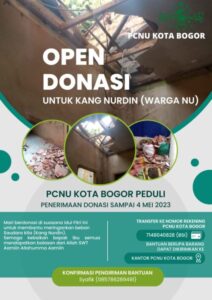 Bagi rekan-rekan yang ingin berdonasi silakan mentransfer ke Rekening PCNU Kota Bogor 7148040828 (BSI). Untuk bantuan berupa logistik bisa kirim ke Kantor PCNU Kota Bogor. Sempur, 05/01, Kecamatan Bogor Tengah, Kota Bogor 16129.