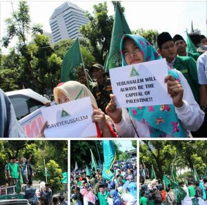 Aksi tersebut digelar sekitar pukul 13.30 WIB. Asep menyebutkan, tuntutan pertama aksi mereka yaitu menolak pernyataan Trump soal status Yerusalem yang diklaim sebagai ibu kota Israel.