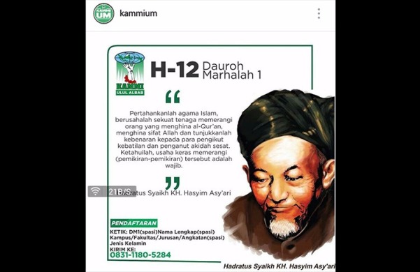 Beberapa waktu lalu, muncul poster ajakan mengikuti Daurah Marhalah I dari Kesatuan Aksi Mahasiswa Muslim Indonesia (KAMMI) Ulul Albab UIN Maliki Malang. Fatalnya, poster yang disebar oleh akun instagram @kammium tersebut mencantumkan foto Hadlratussyekh KH Muhammad Hasyim Asy’ari (Mbah Hasyim) beserta satu dawuhnya sebagai dalil ajakan.