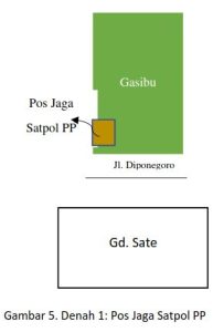 Dari wawancara dengan narasumber, diperoleh informasi terkait tugas pengamanan kawasan Gedung Sate dan Gasibu. Dalam keadaan normal, tugas pengamanan Gedung Sate dan Gasibu dilakukan oleh Satuan Polisi Pamong Praja (Satpol PP) Provinsi Jawa Barat. Terdapat pos jaga Satpol PP di pedestrian Gasibu sebelah Barat Daya, berseberangan dengan sebelah barat laut halaman depan Gedung Sate. Dipisahkan oleh Jl. Diponegoro. Posisi pos Satpol PP di tengah antara Gedung Sate dan Gasibu guna memudahkan mereka melakukan pengawasan. Dari pos tersebut jalan utama menuju ke dalam Gedung Sate terlihat dengan jelas, tanpa penghalang. Sebaliknya, dari pos tersebut, sulit mengawasi secara langsung dengan kasat mata situasi di Gasibu, karena letaknya di sudut bawah Gasibu. Kelemahan ini ditutupi dengan patroli jalan kaki dari anggota Satpol PP di sekeliling Gasibu dalam interval waktu secara random. Selain itu, terdapat sejumlah CCTV di sekeliling Gasibu yang termonitor di layar pos jaga.
