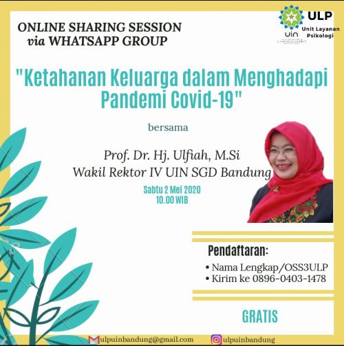 Bertepatan dengan hari Pendidikan Nasional, 02 Mei 2020 Wakil Rekor IV Bidang Kerjasama UIN Sunan Gunung Djati Bandung, Prof. Dr. Hj. Ulfiah, M. Si tampil menjadi pembicara utama dalam Online Shering via Whatsapp bertajuk “Solusi Konseling Ketahanan Keluarga dalam Menghadapi Pandemi Covid-19” yang digelar oleh Unit Layanan Psikologi Fakultas Psikologi UIN Bandung, Sabtu, (02/05/2020).