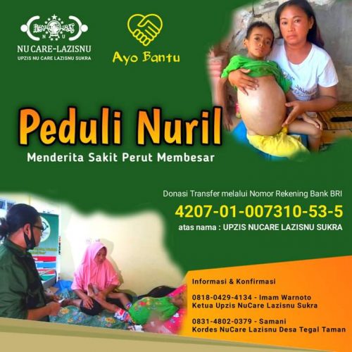 “Ananda Nuril saat ini sedang berjuang melawan sakit tumor pada perut, hingga saat ini perutnya semakin membesar, tentunya kami berharap do’a dan dukungan dari semua pihak agar ananda Nuril segera sembuh. Untuk itu dukungan dalam bentuk donasi sangat kami butuhkan, serta siapapun dapat menyalurkannya melalui nomor rekening Bank BRI atas nama Upzis NuCare Lazisnu Kecamatan Sukra, di nomor rekening 4207-01-007310-53-5. Selanjutnya jika ada informasi atau konfirmasi transfer serta layanan jemput donasi bisa menghubungi nomor Whatsapp berikut : 0818-0429-4134 atau 0831-4802-0379, Insya Allah kami amanah dan setiap rupiah yang masuk akan kami laporkan secara baik, “jelasnya.